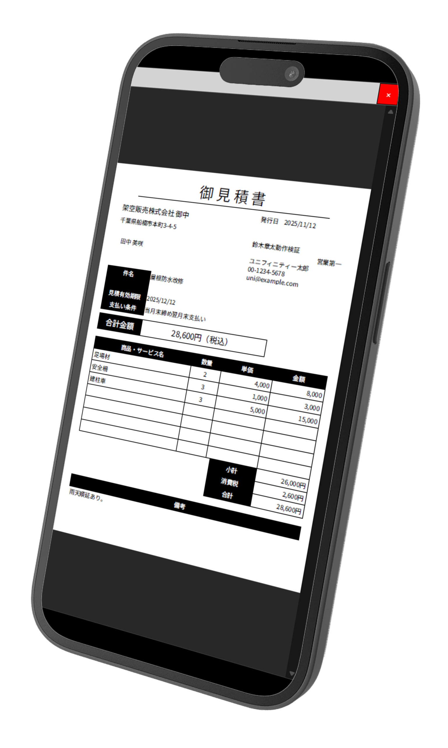 見積書の作成から金額計算、PDF出力までワンストップで行える見積管理アプリです。 自動計算により入力ミスを防ぎ、即時の回答スピードで受注機会を逃さない営業体制を実現。 顧客情報連携で再提案もスムーズになります。