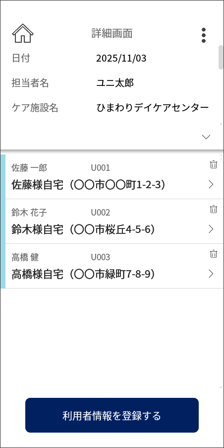 利用者名、ID、ピックアップ場所、送迎先、緊急連絡先を記録し、急変時の連絡・判断を迅速化できます。