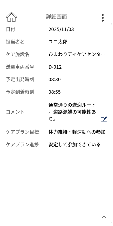 ケアプラン目標、進捗、特記事項を入力し、送迎中にもケアプロセスを共有できます。連携不足を解消し、介護サービス全体の質向上につながります。