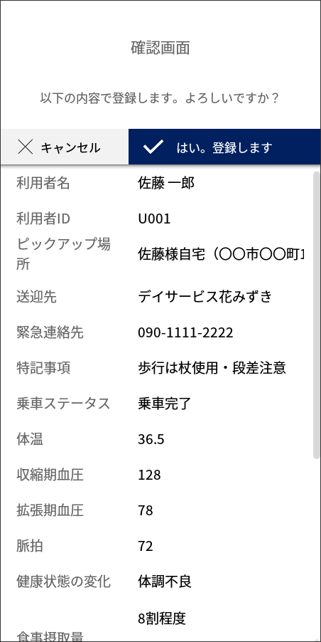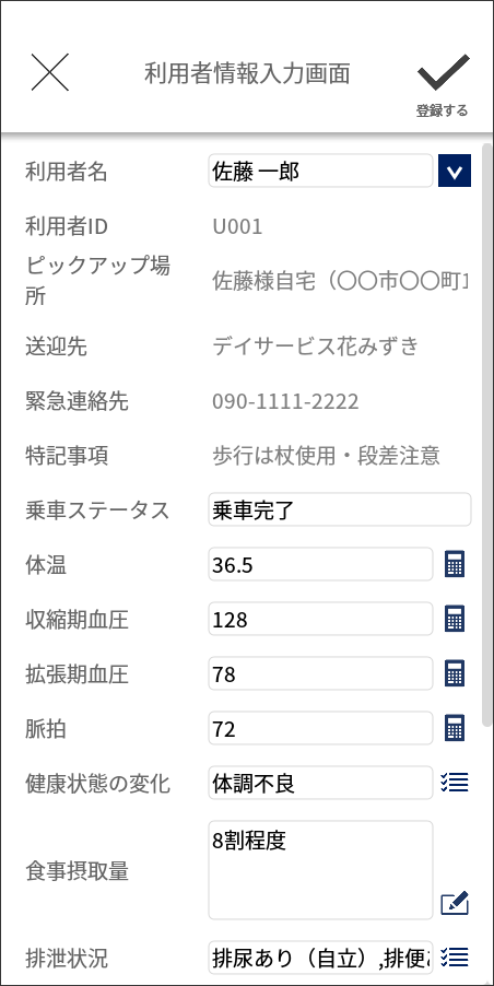 利用者名、ID、ピックアップ場所、送迎先、緊急連絡先を記録し、急変時の連絡・判断を迅速化できます。