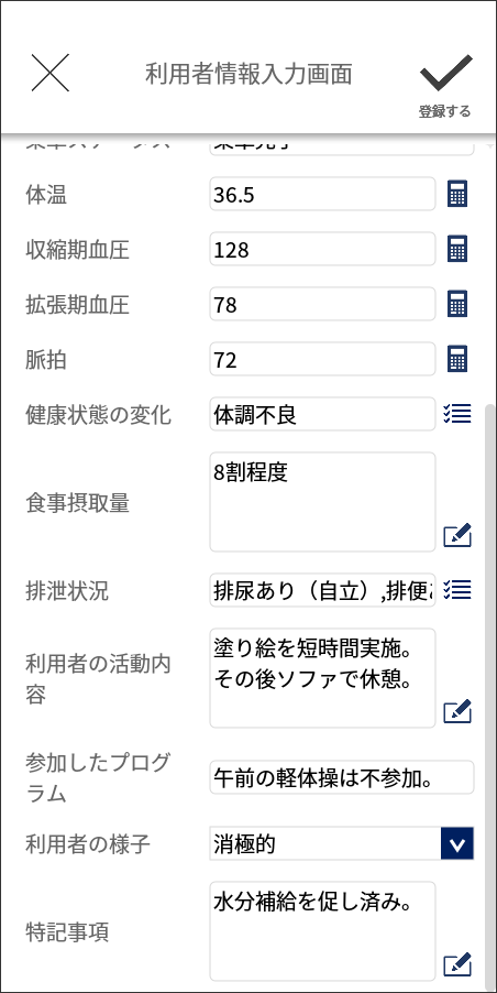 食事摂取量、排泄状況、活動内容、参加したプログラム、様子(意欲的・消極的など)を登録できます。送迎中に把握した変化もケア計画に反映できます。