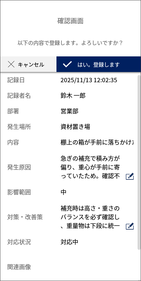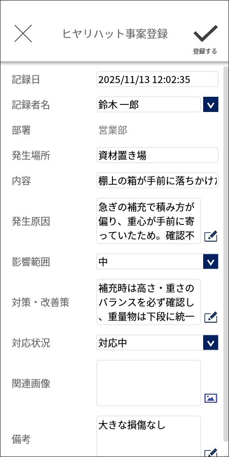 関連画像を添付することで、「どの位置で」「どんな状態で」危険が発生したかが明確になります。文章だけでは伝わりにくい現場状況を共有し、管理者や安全衛生委員会の判断をサポートします。復旧前後の比較にも役立ちます。