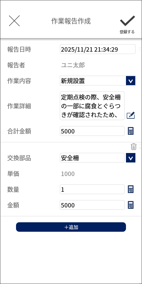 報告日時、作業内容、作業詳細の入力に加えて、交換部品の単価と数量を入力することで金額を自動算出できます。複数部品がある場合も個別の金額や合計金額が自動で計算され、報告書作成にかかる時間を大幅に短縮できます。計算ミスも防止できます。