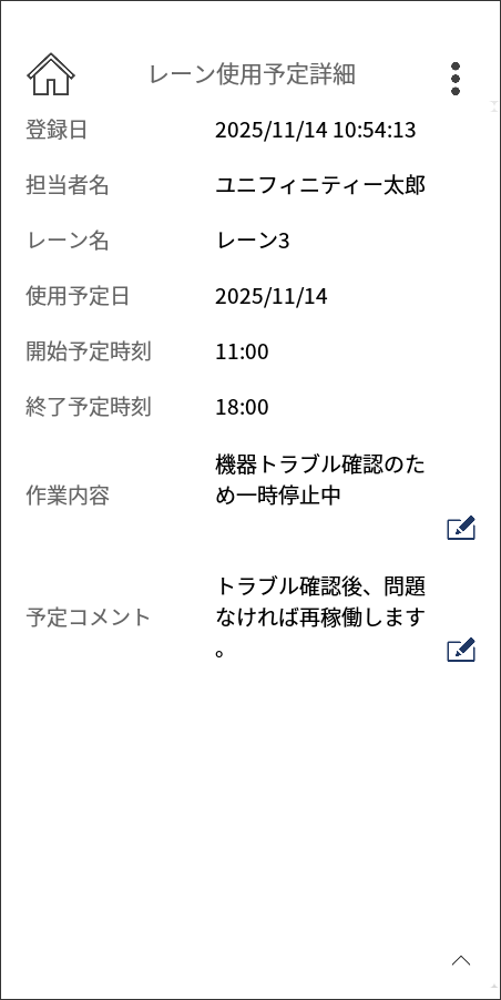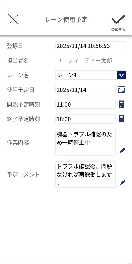 予定ID、レーン名、使用予定開始/終了時刻、作業内容、担当者名などを登録することで、レーンごとの使用計画が明確になります。作業者がどのレーンで何を行うのかが可視化され、段取りや材料準備がスムーズになります。