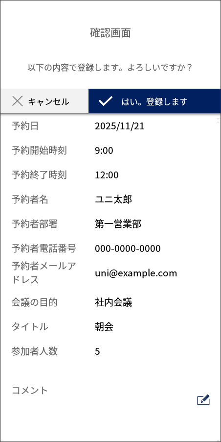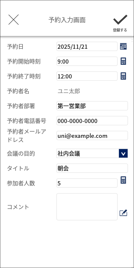 会議室名・収容人数・ステータスなど必要情報を一元管理し、予約ID・日時・利用目的・参加人数などを簡単入力で登録できます。スマホでも入力しやすい画面設計のため、部署をまたいだ利用でも混乱が生じません。予約者情報も自動的に紐づき、連絡先の確認や事務局側のサポートが容易になります。