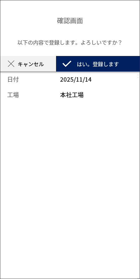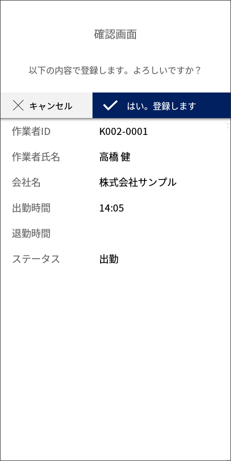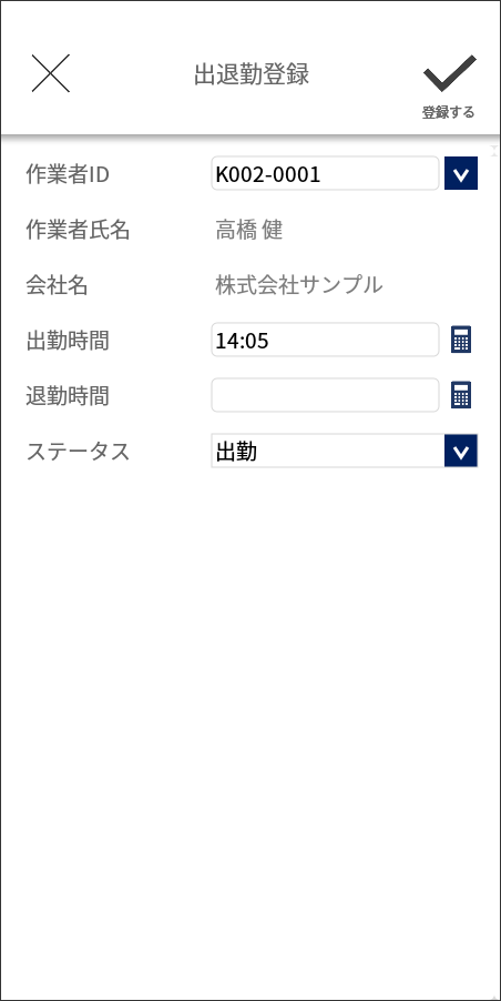 詳細画面に“出勤”“退勤”ボタンを配置し、作業者が現場で即時入力できる仕組みを実現。