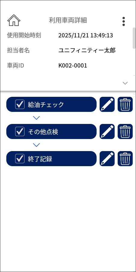 使用開始時刻、担当者名、車両番号、車両タイプ、車種、走行距離、使用目的をその場で記録できます。運転開始前の車両状態を明確に残せるため、後のトラブル対応や情報管理が容易になります。