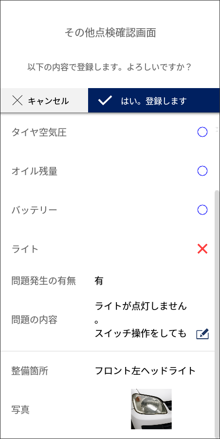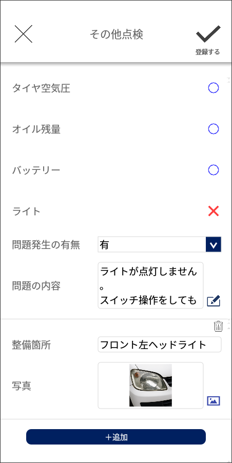 タイヤ空気圧、オイル残量、バッテリー、ライト類などの点検項目を標準化して記録できます。問題の有無や内容、必要なメンテナンス箇所も入力でき、車両状態を的確に管理できます。写真登録にも対応しています。