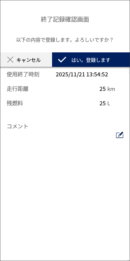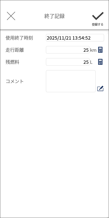 使用終了時刻、走行距離、残燃料、コメントを記録し、利用状況を締めることができます。乗車前後の距離差分による自動集計も可能で、運用記録としての精度が向上します。