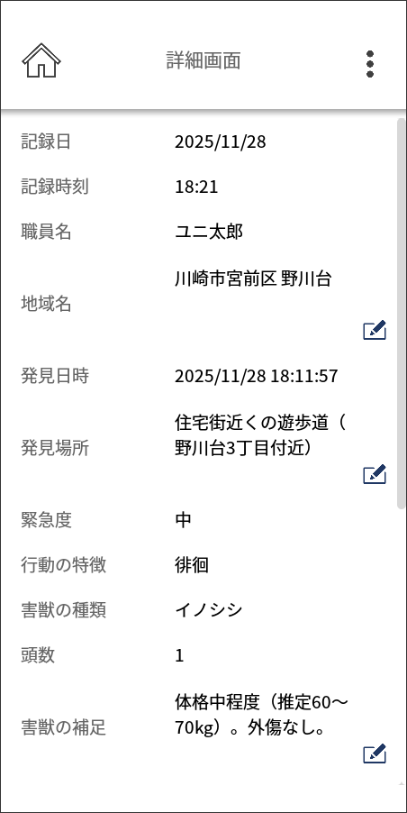 害獣の種類(例:イノシシ・シカ・サル・ハクビシンなど)、頭数、発見地域の環境(山間部・農地・住宅地・川沿いなど)を記録。地域別の対策検討に役立ちます。