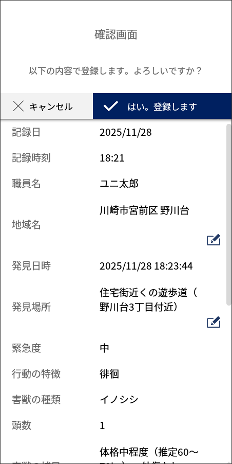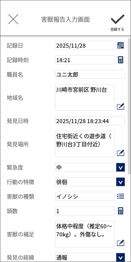 害獣の種類(例:イノシシ・シカ・サル・ハクビシンなど)、頭数、発見地域の環境(山間部・農地・住宅地・川沿いなど)を記録。地域別の対策検討に役立ちます。