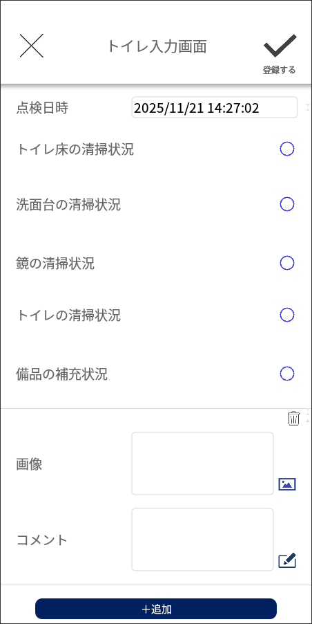 トイレットペーパーや洗剤、ナプキンなど、エリアごとの補充状況を入力できます。補充漏れによるクレームや業務中断を防ぐために役立ち、運営効率を高めます。