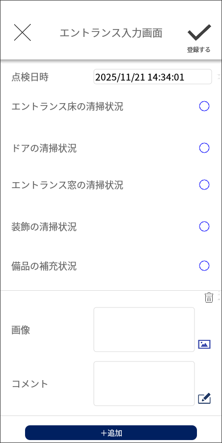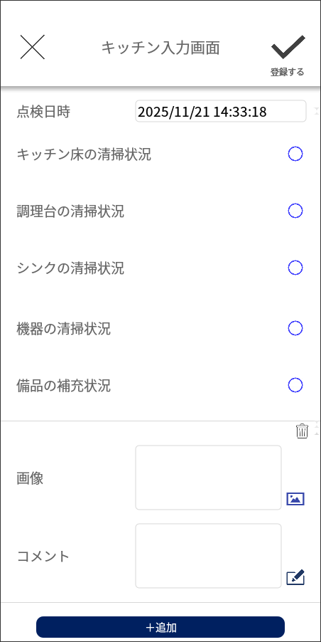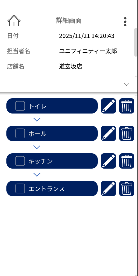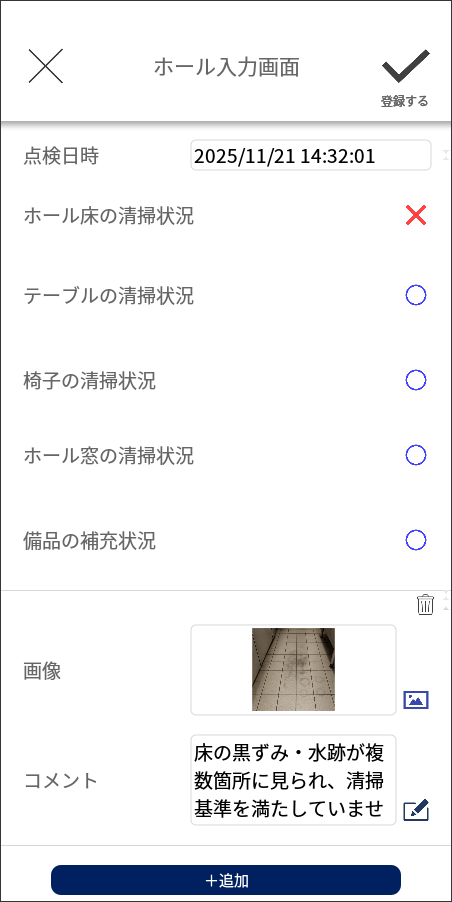 トイレ・客席・キッチン・エントランスなど店舗内の主要エリアごとにチェック項目を入力できます。状況が細分化されているため、清掃品質のばらつきを減らし、誰が点検しても同じ基準で記録できます。