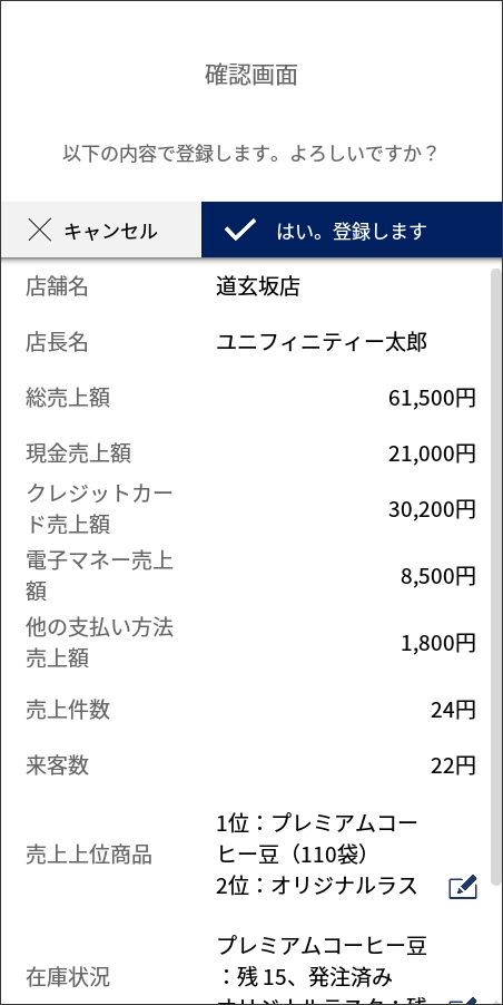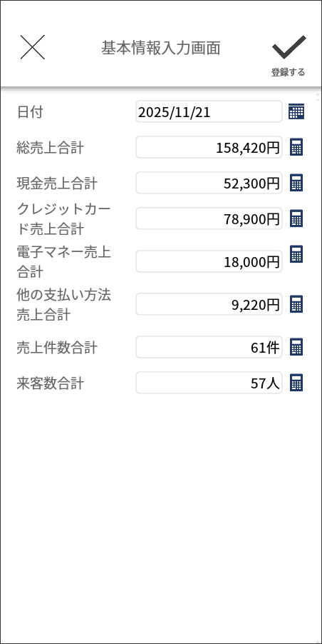 日次の売上・客数・決済方法別売上、商品別ランキングを自動集計できる販売報告アプリです。