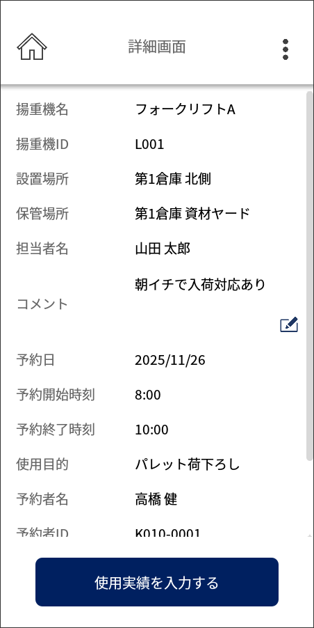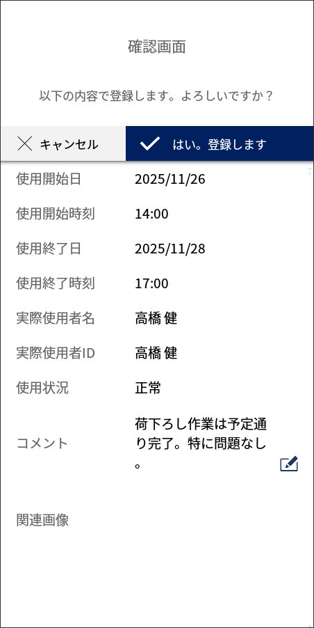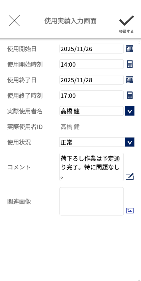 使用開始日・時刻、使用終了日・時刻、実際の使用者ID・名前を記録することで、予約情報との差異を正確に把握できます。実使用者の履歴が残るため、万が一の事故やトラブルの際にも追跡が容易です。また、実際の稼働状況を把握することで、利用効率や稼働率の改善にもつながります。