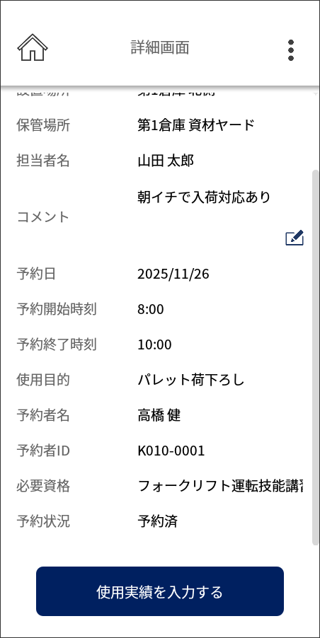 予約日、予約時間帯、予約者情報、使用目的、必要資格、予約状況(予約済・キャンセル・使用中)を詳細に記録できます。必要資格を含めた予約管理により、資格未取得者による誤予約を防ぎ、安全性を担保できます。予約状況を可視化することで、現場間の利用調整が容易になります。