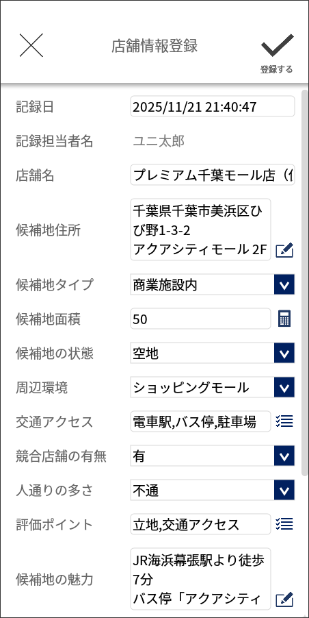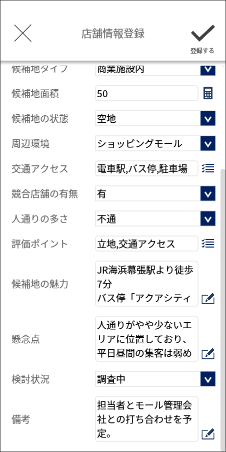 店舗開発の候補地調査に必要な立地条件、周辺環境、競合、魅力・懸念点をまとめて記録できるアプリです。