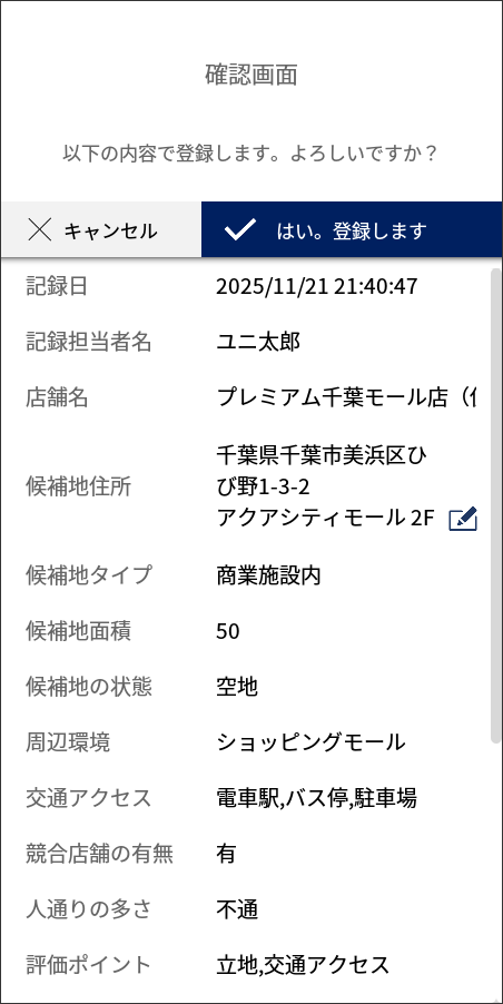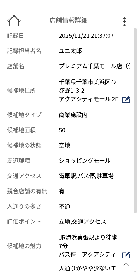 候補地住所、候補地タイプ、面積、敷地状態、周辺環境、交通アクセス、競合状況、人通り、評価ポイントなどの店舗開発に必要な情報を体系的に記録できます。現地調査のたびに情報が更新され、検討会議での判断材料としてそのまま活用できます。