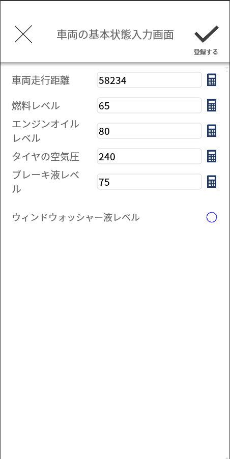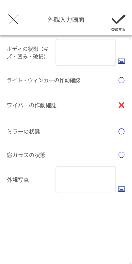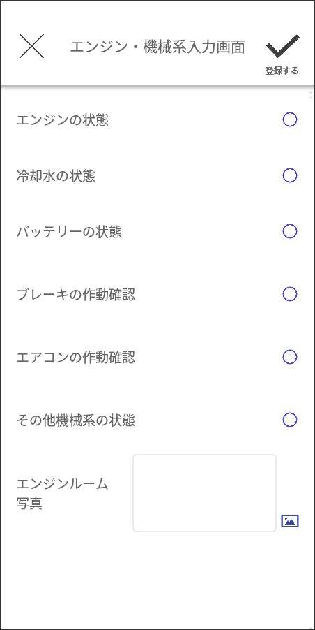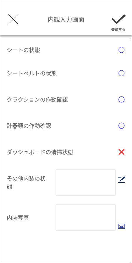車両の外観・内装・エンジン・安全備品などを細かく点検し、写真付きで記録できるアプリです。