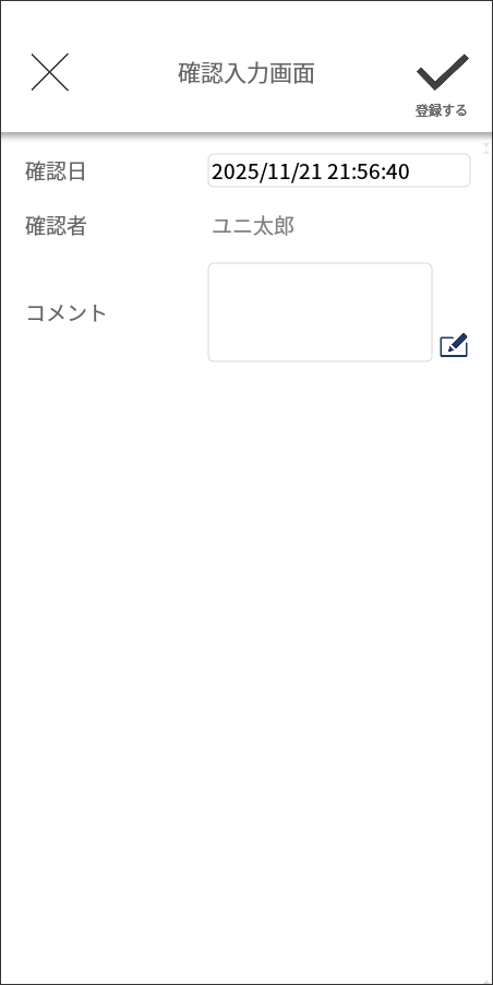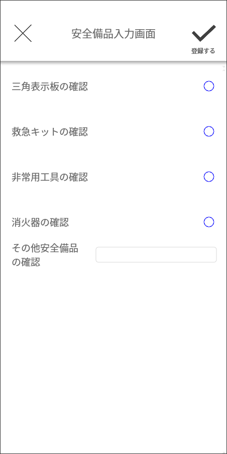 三角表示板、救急キット、非常用工具、消火器などの安全備品確認を必須項目として記録できます。最終確認日と確認者、コメントを残すことで、誰がいつ点検を完了したかが一目でわかります。監査対応や事故発生時の説明責任にも応えられる運用が可能になります。