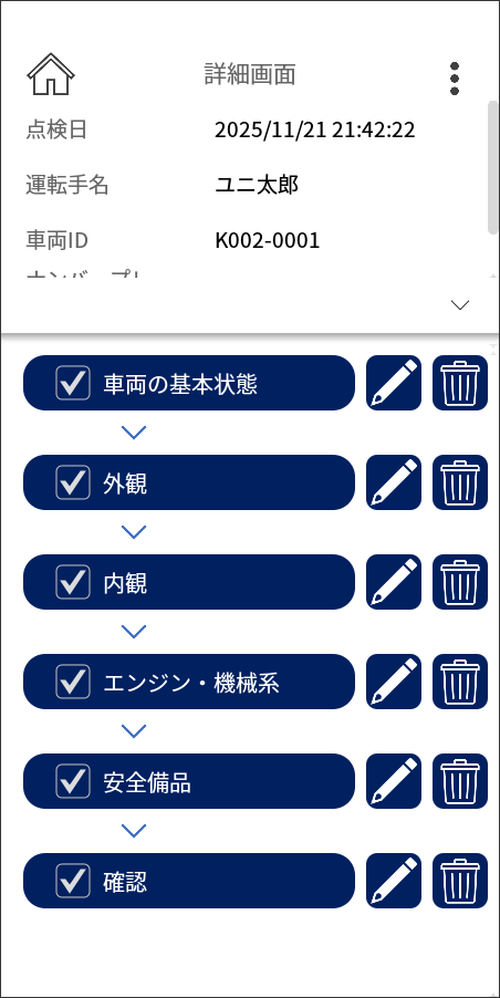 - 点検日・車両ID・運転手・点検時間を一元管理でき、車両ごとの点検履歴を即座に確認できます
