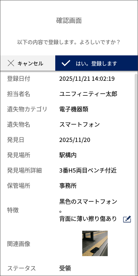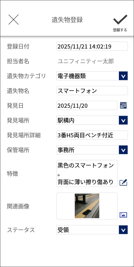 登録日、発見場所、遺失物名、カテゴリ、特徴、状態、保管場所、担当者名、コメントなどを現場でそのまま登録できます。詳細な属性情報を記録できるため、後からの照合精度が向上し、問い合わせ対応の効率化に役立ちます。