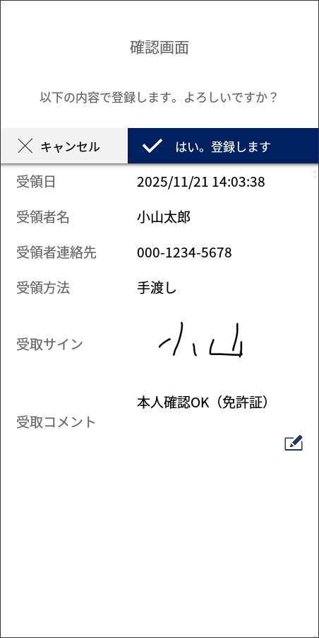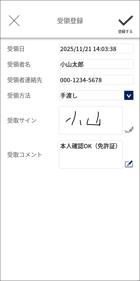 受領者名、連絡先、受領方法、受領日、受領状況を記録でき、受取サインもアプリ内で取得できます。紙の受取票が不要になり、不備や紛失の心配がなくなります。