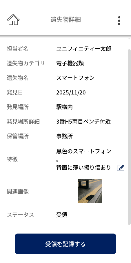 「発見」「保管中」「受領待ち」「受領済み」などのステータスをアプリ内で一元管理できます。現在の遺失物の状況を一覧画面で即確認でき、運営チーム間の情報共有が容易になります。