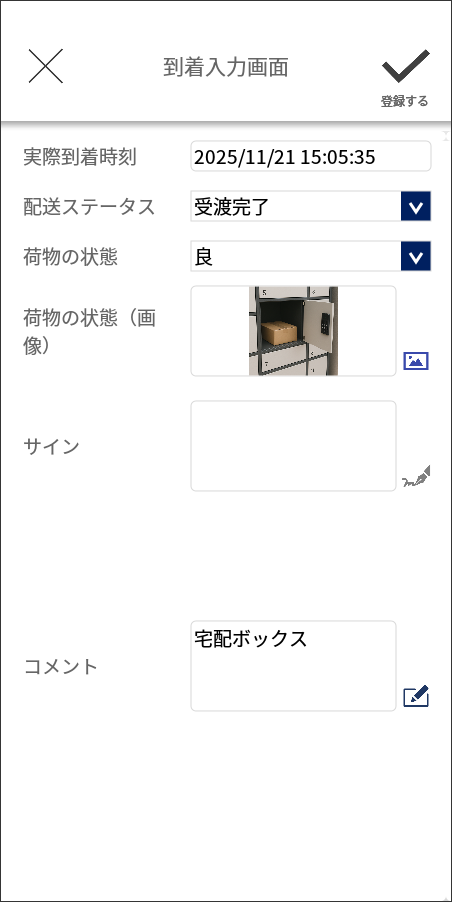 荷物の状態をテキストと画像で同時に記録できます。「破損」「未開封」「通常状態」などの状態が明確になり、トラブル時の証拠となります。受渡し時に確認した状態を記録することで、責任範囲の明確化にもつながります。