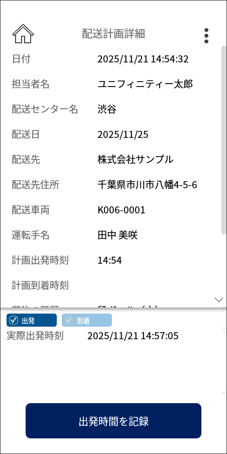 配送日、配送車両、運転手、配送先、荷物情報、計画時間などを事前に登録できます。計画出発・到着時刻や経路の入力もでき、現場担当者が工数なく確認できる計画データが作成されます。事前登録により、当日の配送手配漏れや開始遅延の防止にもつながります。