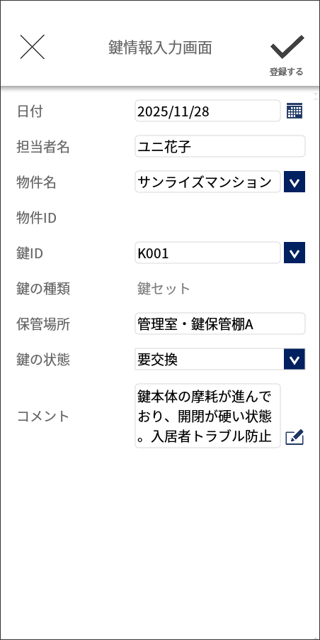 物件名、鍵ID、鍵の種類(鍵セット・スイッチキー・デジタルキーなど)、保管場所、鍵状態(良好/要交換/紛失)を記録できます。状態変化を履歴として残せるため、交換判断や紛失トラブル対応がスムーズになります。
