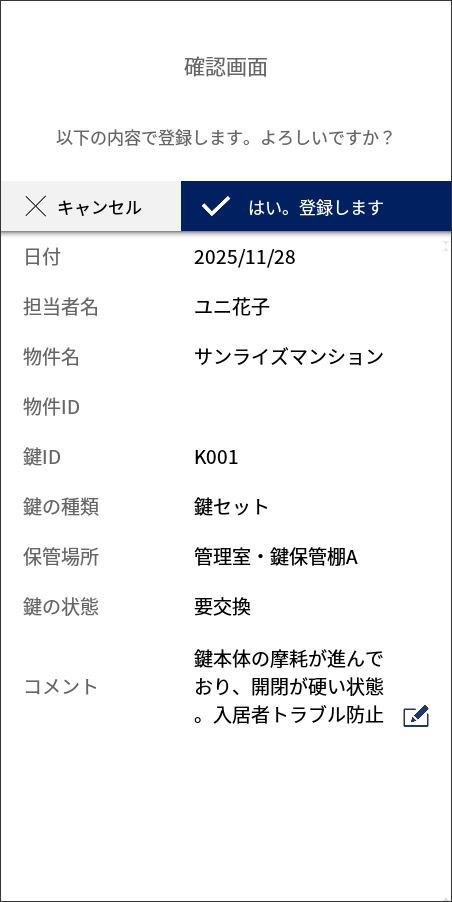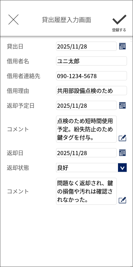 返却日、返却時の状態(良好/損傷/不良)、コメントを登録し、鍵の破損や交換必要性を記録できます。元の状態と比較でき、負担費用の判断も明確になります。