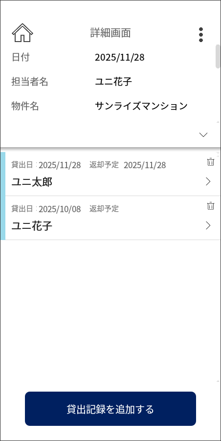 貸出・返却のコメント履歴により、状況説明(急な内覧依頼・業者点検・緊急対応など)が明確になります。担当者間の引き継ぎにも活用できます。