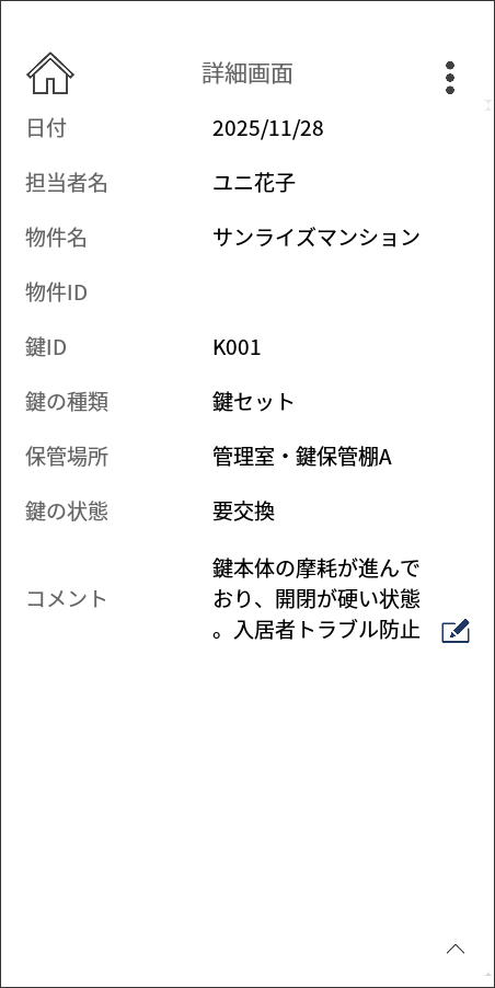 - 鍵の状態(良好/要交換/紛失)が記録されておらず、劣化・損傷による誤作動やトラブルに気づけない