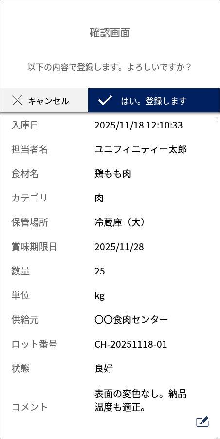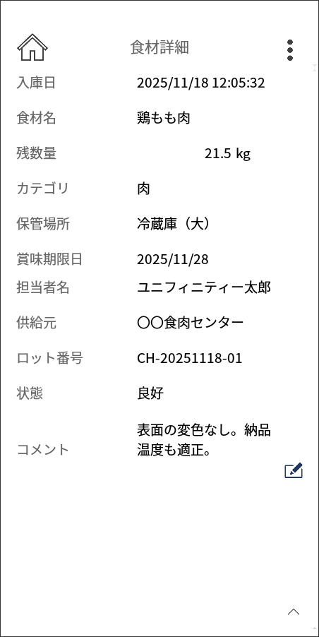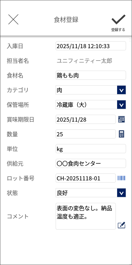 - 食材の状態・賞味期限・ロット番号を一元管理でき、在庫管理の精度が向上します