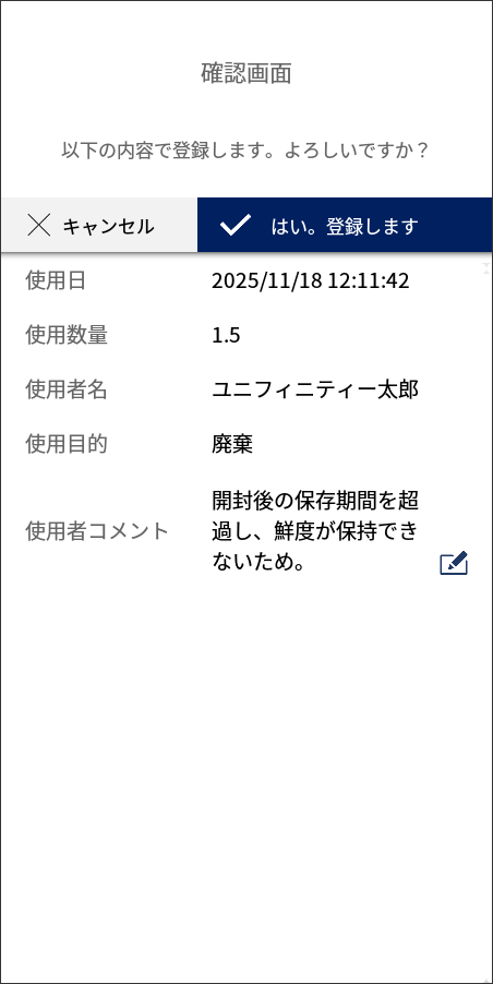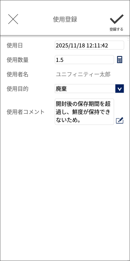 使用日、使用数量、使用者名、使用目的などを記録でき、誰がどの食材をどれだけ使用したかを追跡できます。食品の移動履歴が残るため、トレーサビリティ向上や衛生管理計画(HACCP)の補強にもつながります。厨房内の責任分担も明確になります。