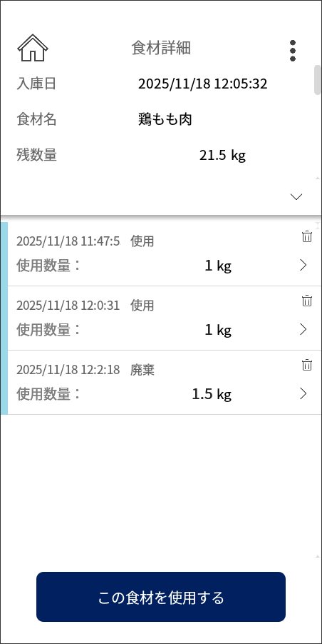 飲食店・給食施設向けに、食材の入庫・賞味期限・使用履歴を管理できるアプリです。