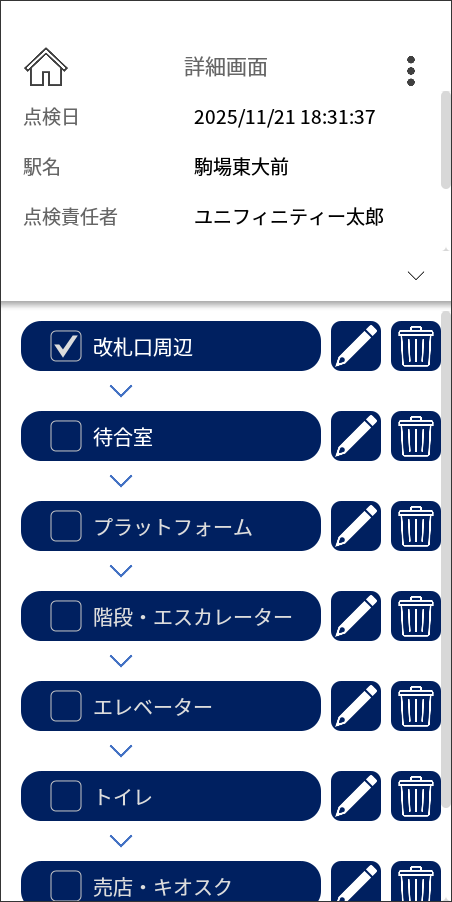 点検日、駅名、点検責任者、点検開始・終了時刻を入力し、駅構内の複数エリアに紐づけて清掃点検を管理できます。点検は改札口、待合室、プラットフォームなどの区画別に統一された項目で実施でき、異なる担当者や時間帯でも同じ品質基準で記録できます。