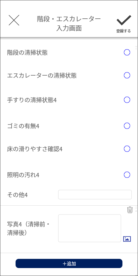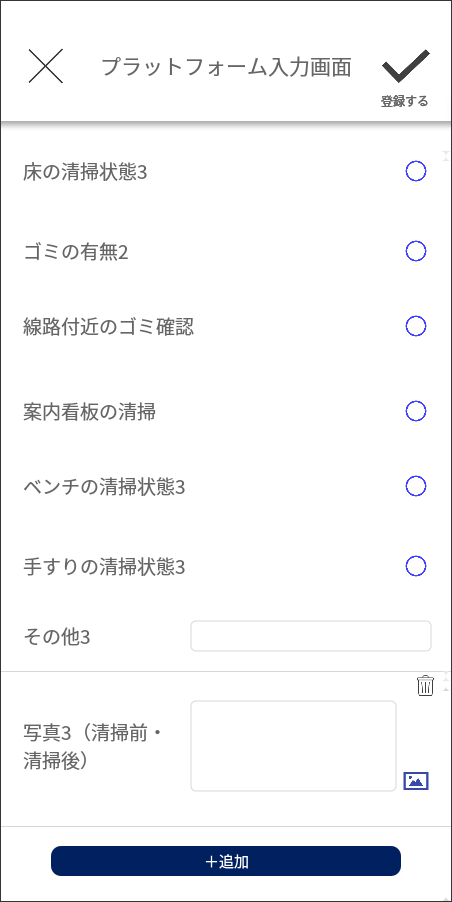 駅構内の改札・ホーム・階段・トイレ・売店など広範囲の清掃状態を写真付きで記録できるアプリです。