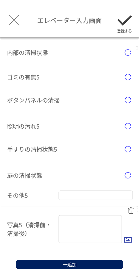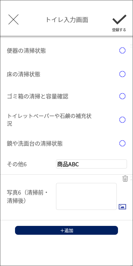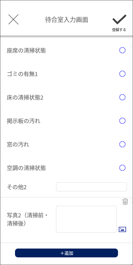 汚れ・ゴミ・機器不良など、異常があった場合は「その他」欄に詳細説明を入力できます。補足文と写真を紐づけて記録できるため、改善指示、外部委託清掃業者への依頼、対応履歴の管理にも活用できます。