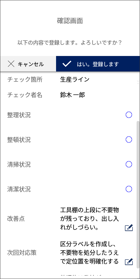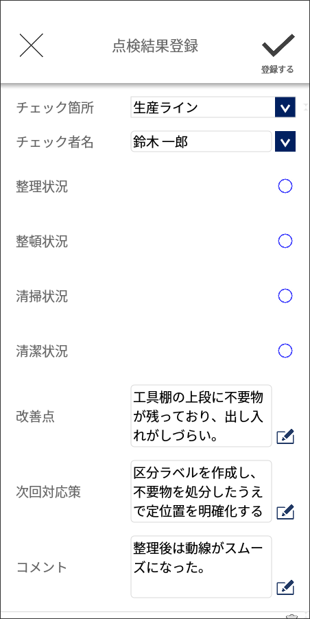 - 現場の整理・整頓・清掃・清潔の状況を明確に記録でき、改善活動の継続性が高まります