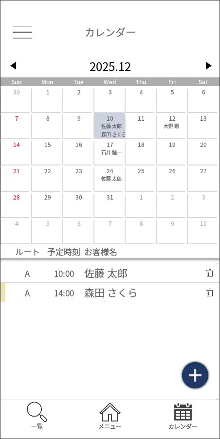顧客名検索、バーコード検索、ルート検索、カレンダー表示に対応。