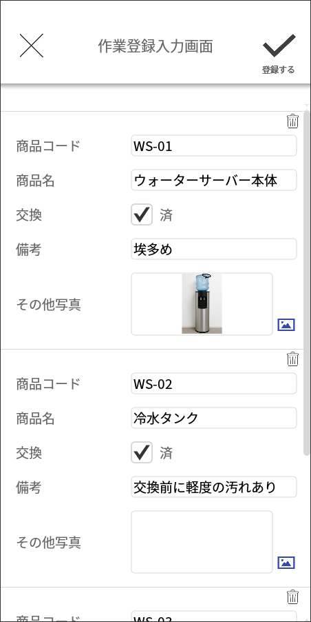 作業現場で、商品・機器ごとに作業内容、交換有無、状態、コメントをまとめて入力できます。