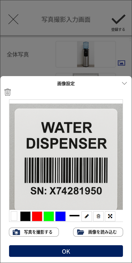 作業前後の状態、シリアル番号、設置状況を撮影し、マーキングや手書き補足を加えて保存可能。